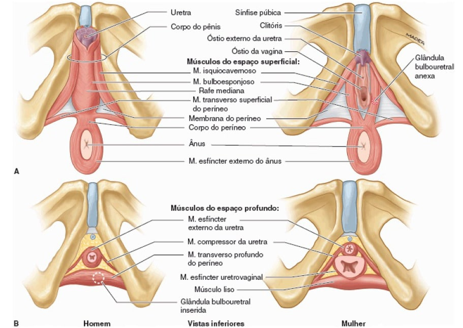 Em português claro: o períneo vai do osso púbico ao cóccix (frente–trás) e de uma tuberosidade isquiática à outra (lado–lado). Imagine um “tapete elástico” que fecha o assoalho da pelve e mantém bexiga, útero e intestino no lugar. Suas funções principais: