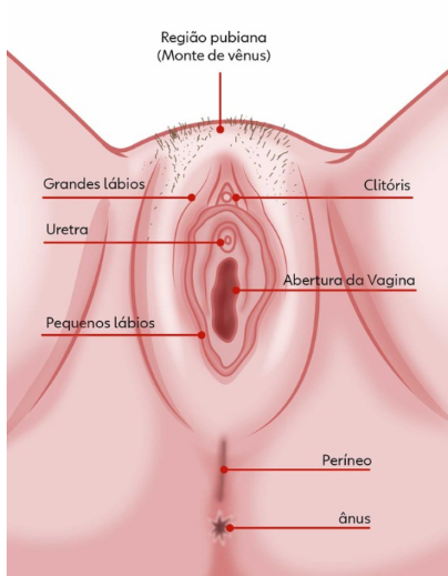 - Vulva: é a parte externa, o que você vê no espelho. Inclui os grandes e pequenos lábios, clitóris, uretra e abertura vaginal.